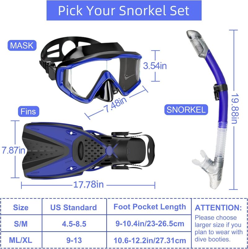 As an experienced snorkeler, I’ve tried many gear sets, but this one truly stands out. The swim goggles provide unparalleled visibility, making me feel immersed in the underwater scenery. The anti-fog coating kept my view crystal clear. The dry top snorkel design keeps water out with ease. And the powerful flippers let me glide effortlessly through the ocean. This comprehensive set has elevated every snorkeling trip I’ve taken. It’s a must-have for unlocking a new level of underwater exploration.
